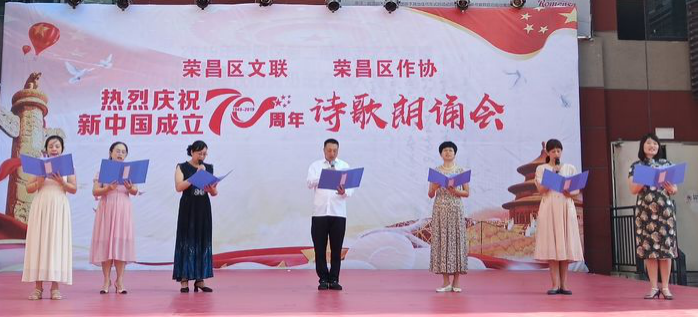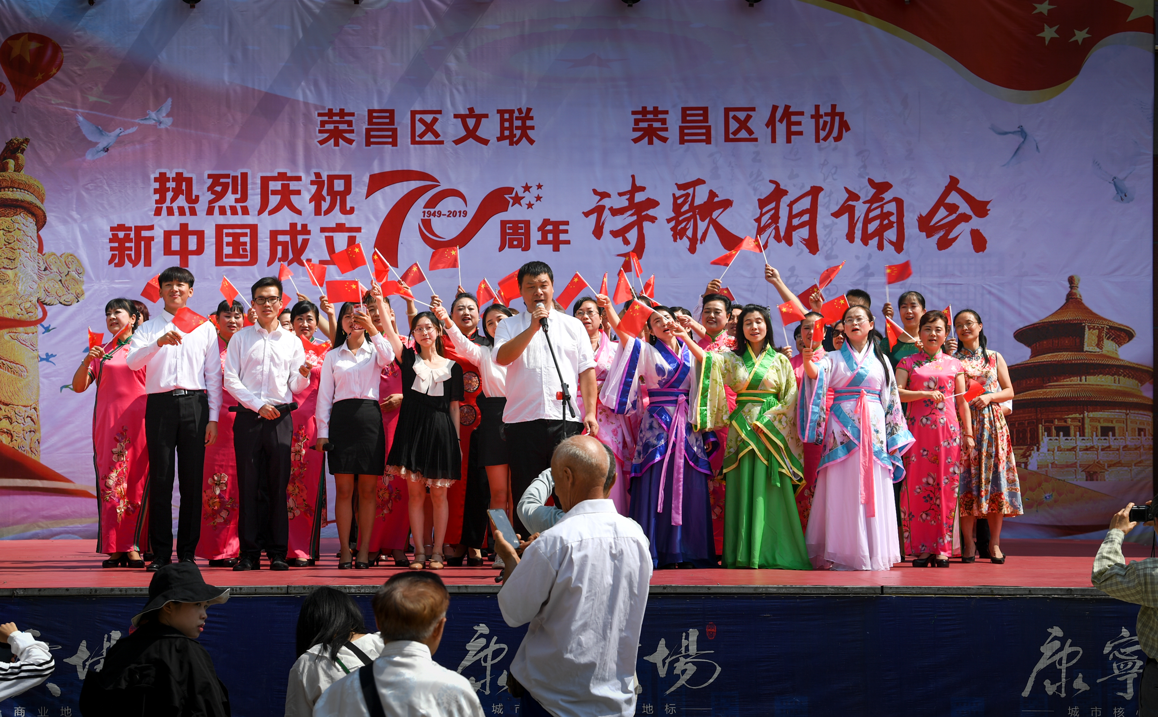 2019年9月22日上午,荣昌区康宁广场人头涌动,由荣昌区文联、区作协主办的庆祝新中国成立70周年诗歌朗诵会在此举行,50多位荣昌作家聚集一起,用诗朗诵、歌曲演唱、武术表演、乐器演奏等形式庆祝新中国成立70周年。