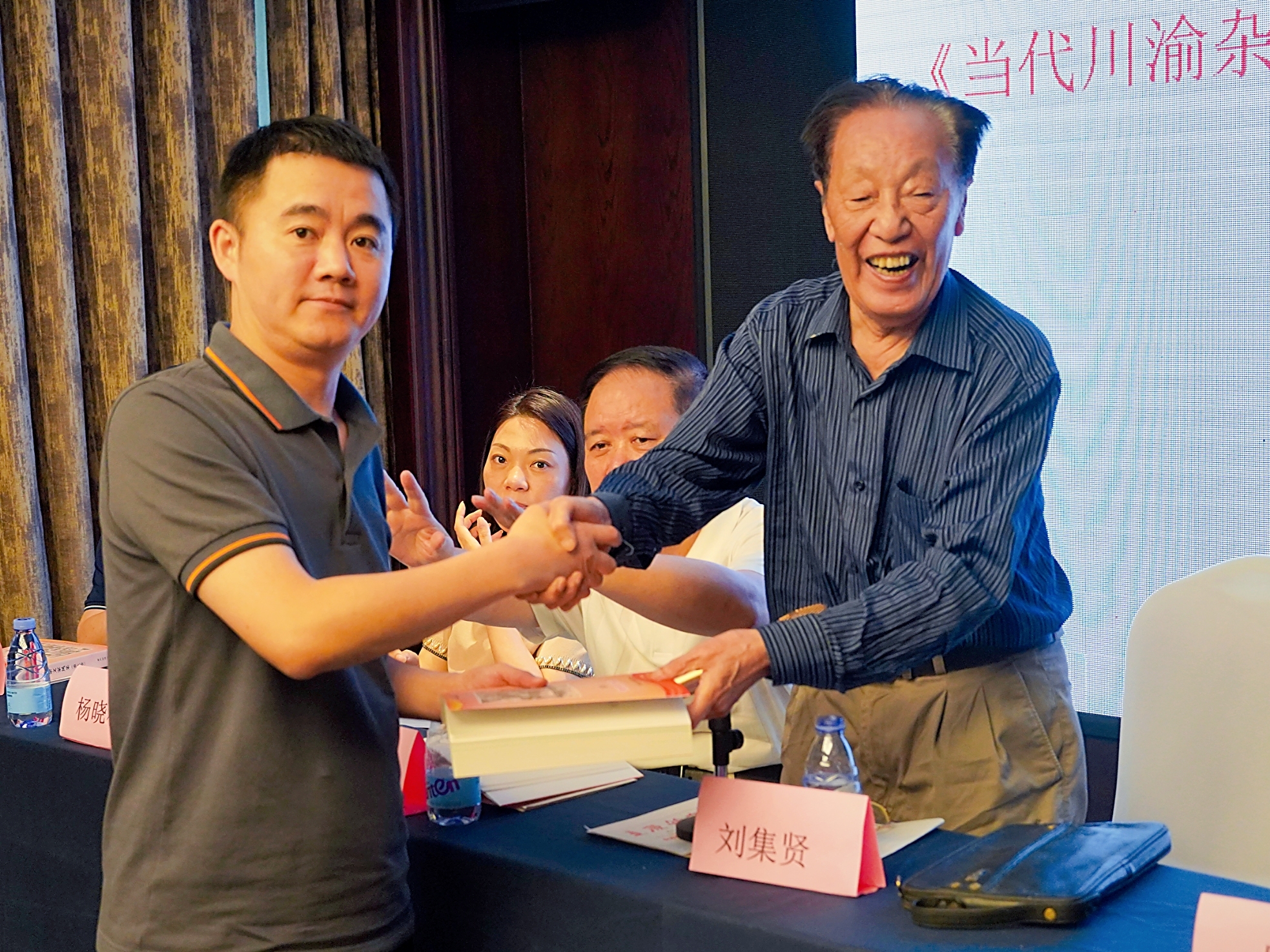 重庆市杂文学会会长刘集贤(右)赠书。