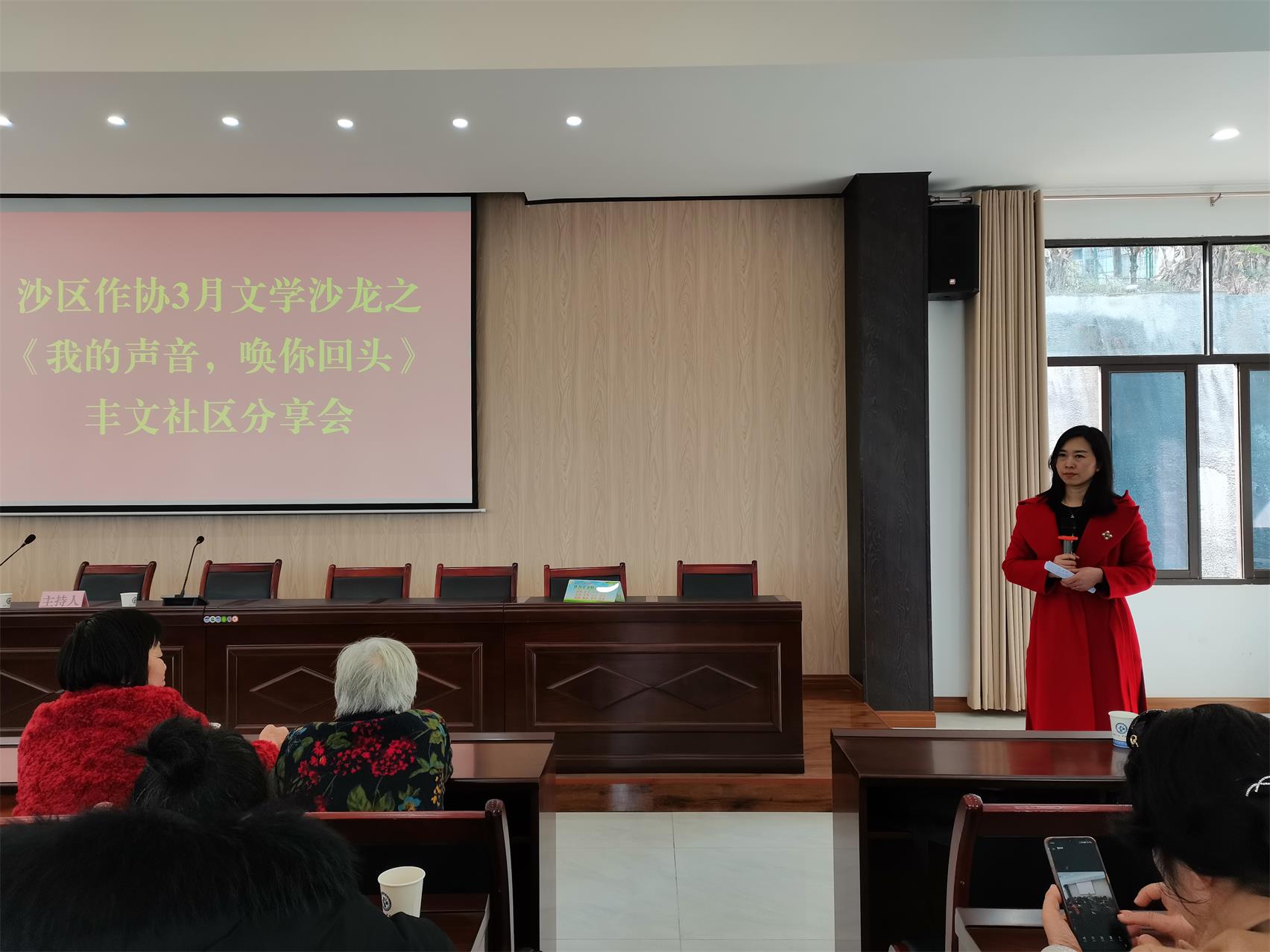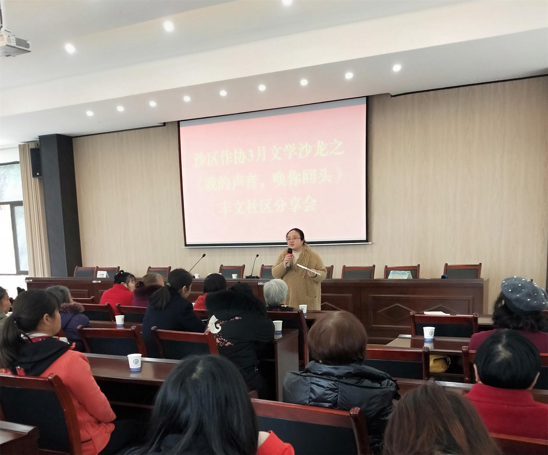 3月1日下午,世界杯官网首页副主席李燕燕长篇报告文学《我的声音,唤你回头——与〈民法典〉关联的女性权益故事》创作分享会在沙坪坝区丰文街道丰文社区举办。这是沙坪坝区品牌文学“文学沙龙”活动,是区文联 “为民办实事、文艺进社区”系列活动之一,也是临近“三八节”的一次献礼活动。沙区作协副主席兼秘书长王京主持分享会。