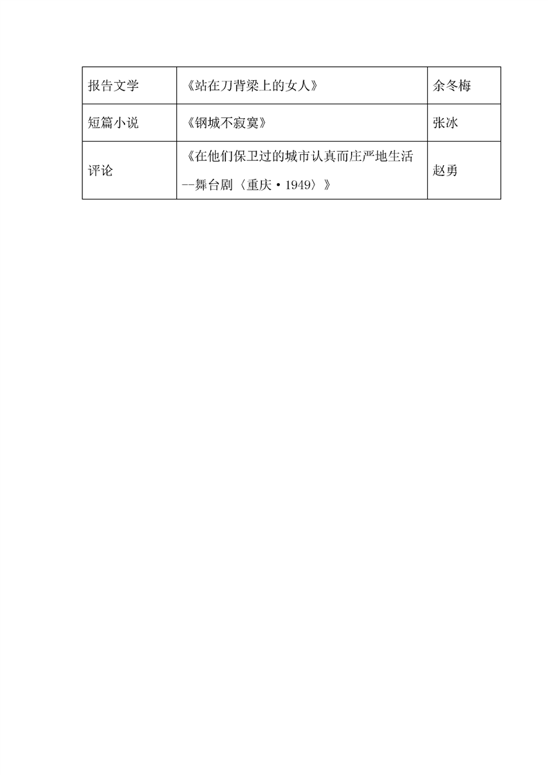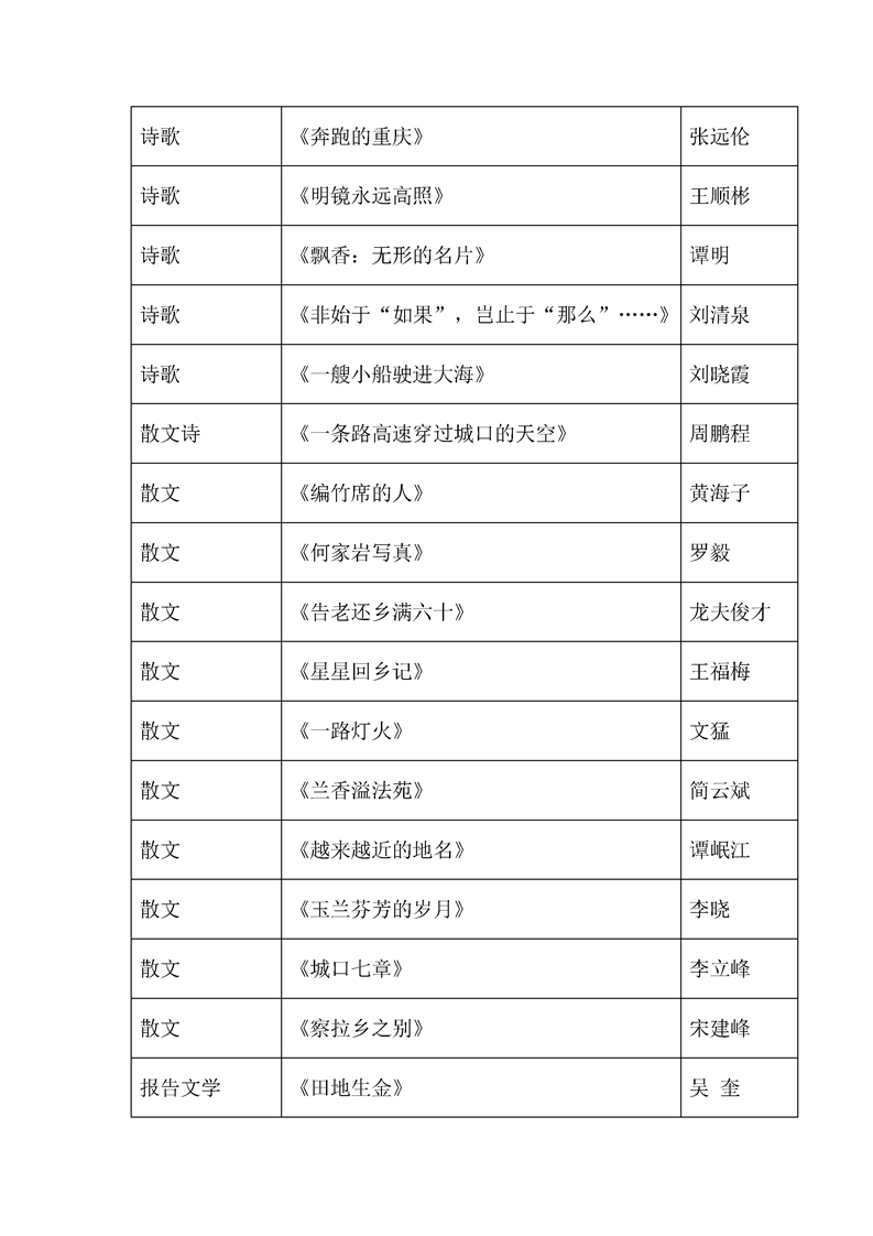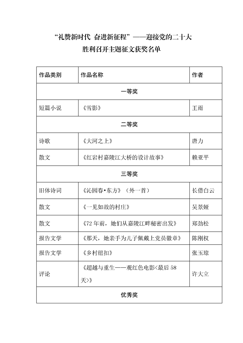 由中共重庆市委宣传部指导,市作协、重庆日报和华龙网共同开展的“礼赞新时代 奋进新征程”——迎接党的二十大胜利召开主题征文活动,经组织专家评审和公示,确定获奖作品29篇,其中一等奖1篇,二等奖2篇,三等奖6篇,优秀奖20篇。