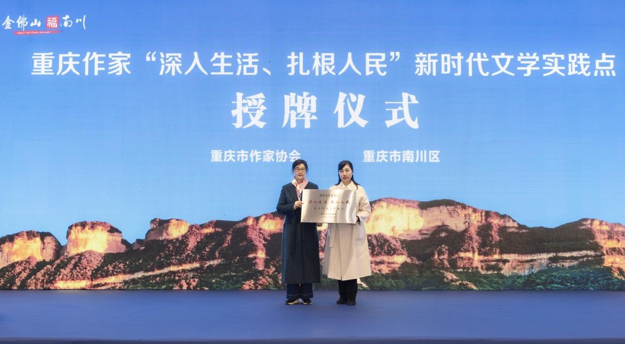 授牌仪式上,彭学明、冉冉、康平分别代表中国作协、重庆市作协和南川区签订“新时代文学实践点”三方合作协议。邱华栋、冉冉分别代表中国作协、重庆市作协向南川区授予中国作家、重庆作家“深入生活、扎根人民”新时代文学实践点牌匾。邓凯向作家代表冉冉、海飞授旗,正式启动“绿水青山·乡城南川”主题实践活动。
