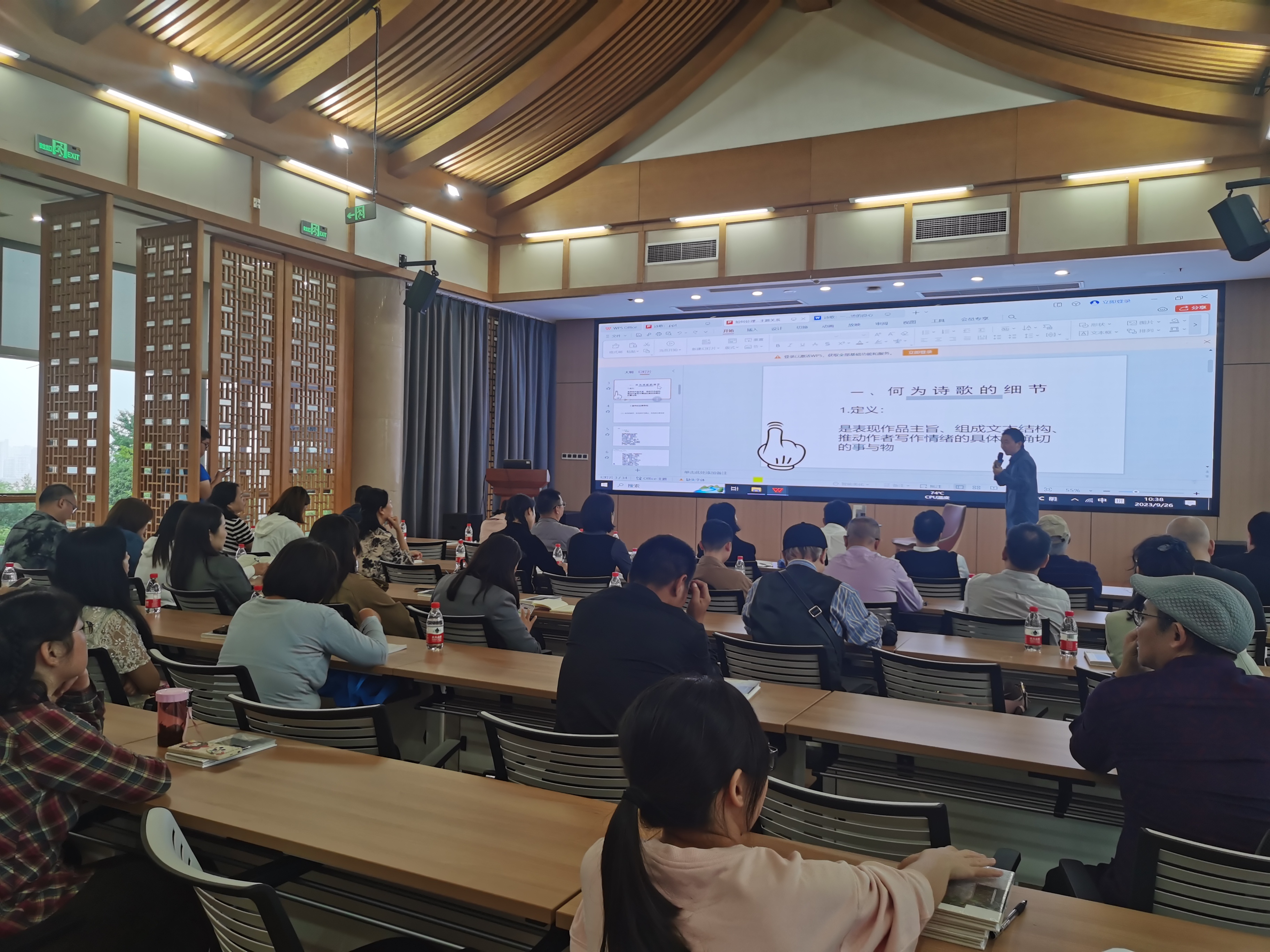 “细节构成作品的全部价值!”“如何处理好诗歌的细节和主题关系”是本次讲座中最重要的“干货”和“实战内容”。熊焱在讲座中从诗歌出发,而又不止步于诗歌,他以数十首诗歌为案例来讲文学创作中的“细节”问题,甚至他还以小说创作举例:“小说由情节构成,情节又由细节构成。细节是表现作品主旨、组成文本结构、推动作者写作情绪的具体而确切的事与物。”诗歌也是如此,“在情感和情绪爆发点时,不能偷懒,要注重细节的书写!”