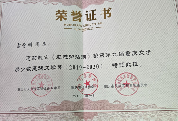 这份赤诚与坚韧,终得岁月回响,结出丰盈之果:国家级殿堂的叩响——荣膺中国教育报、天津社会科学院全国征文大赛一等奖;巴渝文坛的熠熠星光——摘得中共重庆市委宣传部中国梦主题征文二等奖、重庆市文广局学习贯彻党的二十大精神征文一等奖;思想深度的权威认可——荣获重庆市人民政府发展研究成果二等奖;本土文学的最高桂冠——问鼎第九届重庆文学奖;身份的确立与荣光——以卓著的文学成就,稳步踏入中国作家协会、中国散文学会的圣殿,成为全国为数不多的一员。
